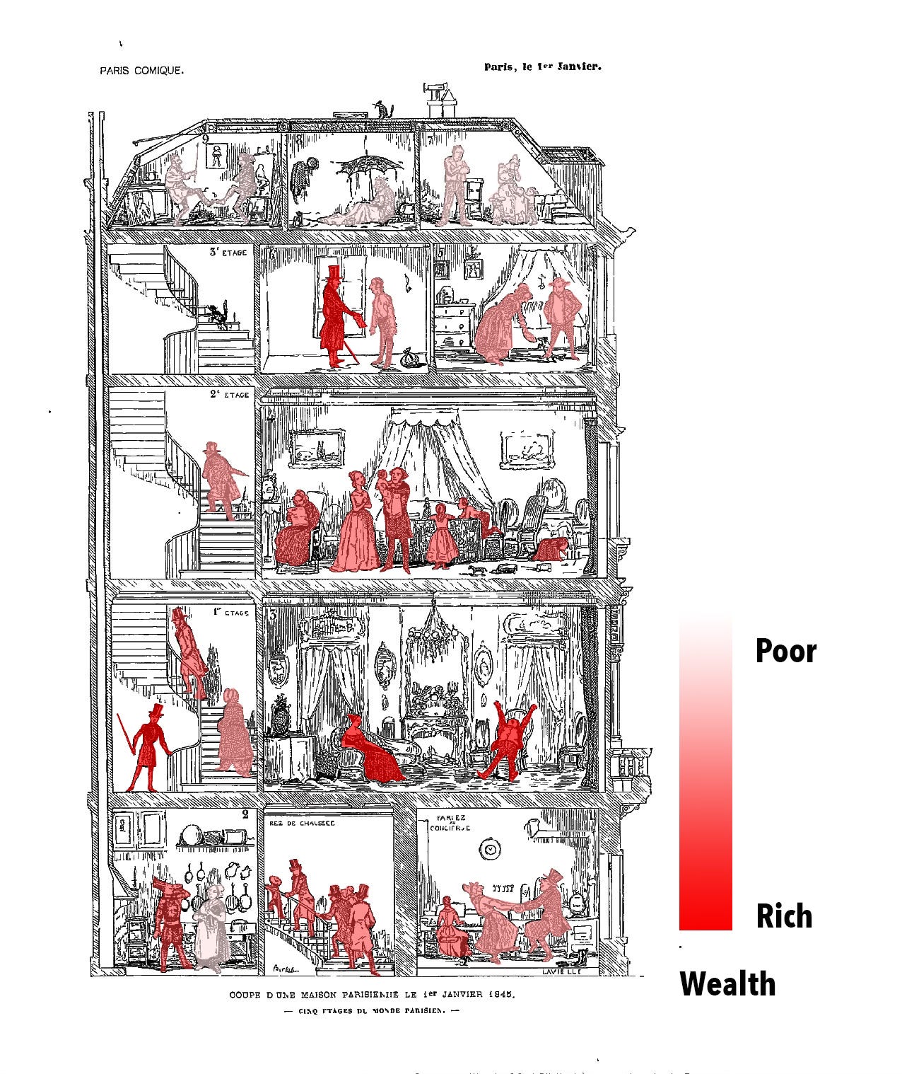 Mixed-income courtyard blocks are the norm in many Scandinavian, French, German, and Italian cities. A 19th-century illustration famously shows the vertical distribution of wealth in Parisian apartment buildings—from the affluent on the lower floors to the working class in the upper walk-ups: