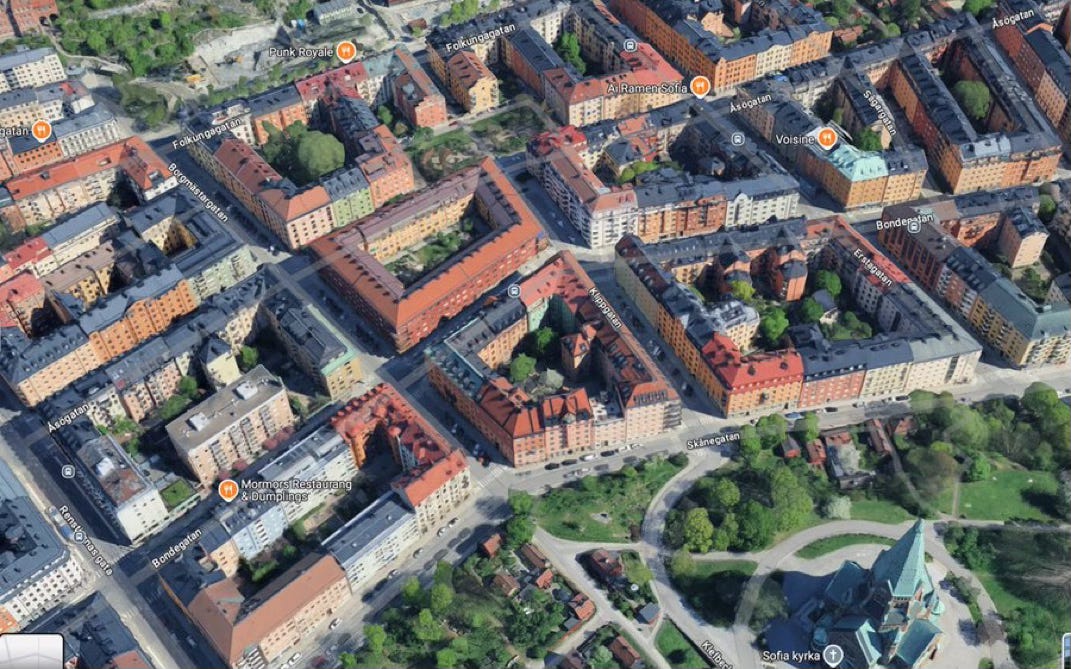 Now let us look at small-lot courtyard blocks in Prague and Oslo. The courtyards here are not designed as part of a single mega-development—they emerge organically from the way individual buildings are constructed around the block.