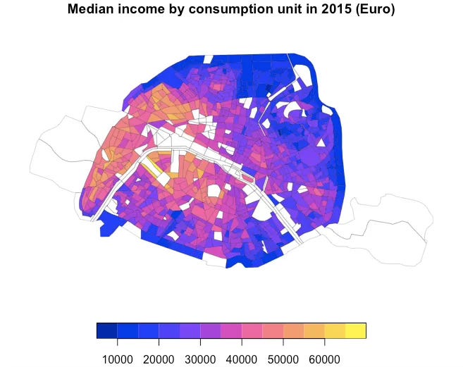 Mixed-income buildings can help counteract the spatial segregation common in many American cities. A Parisian blogger living in San Francisco noticed that American urban neighborhoods tend to be very rich or very poor, while Paris had greater income diversity. He made a map to visualize the smoother income gradients in Paris: