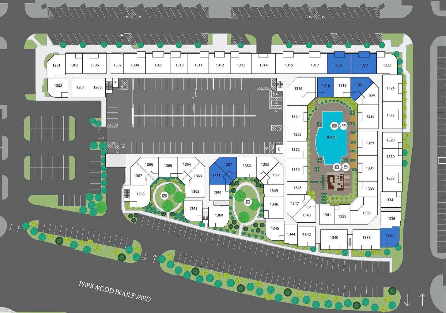 As we can see from the aerial view and building floorpans, this is a mega-development. The courtyard is enclosed by a single structure that is very large. The units are all small and accessed via a network of corridors that run circuits inside the building. The entire building is surrounded by parking lots.
