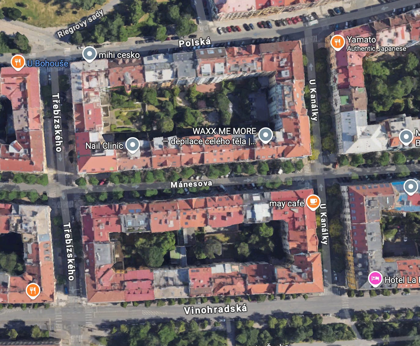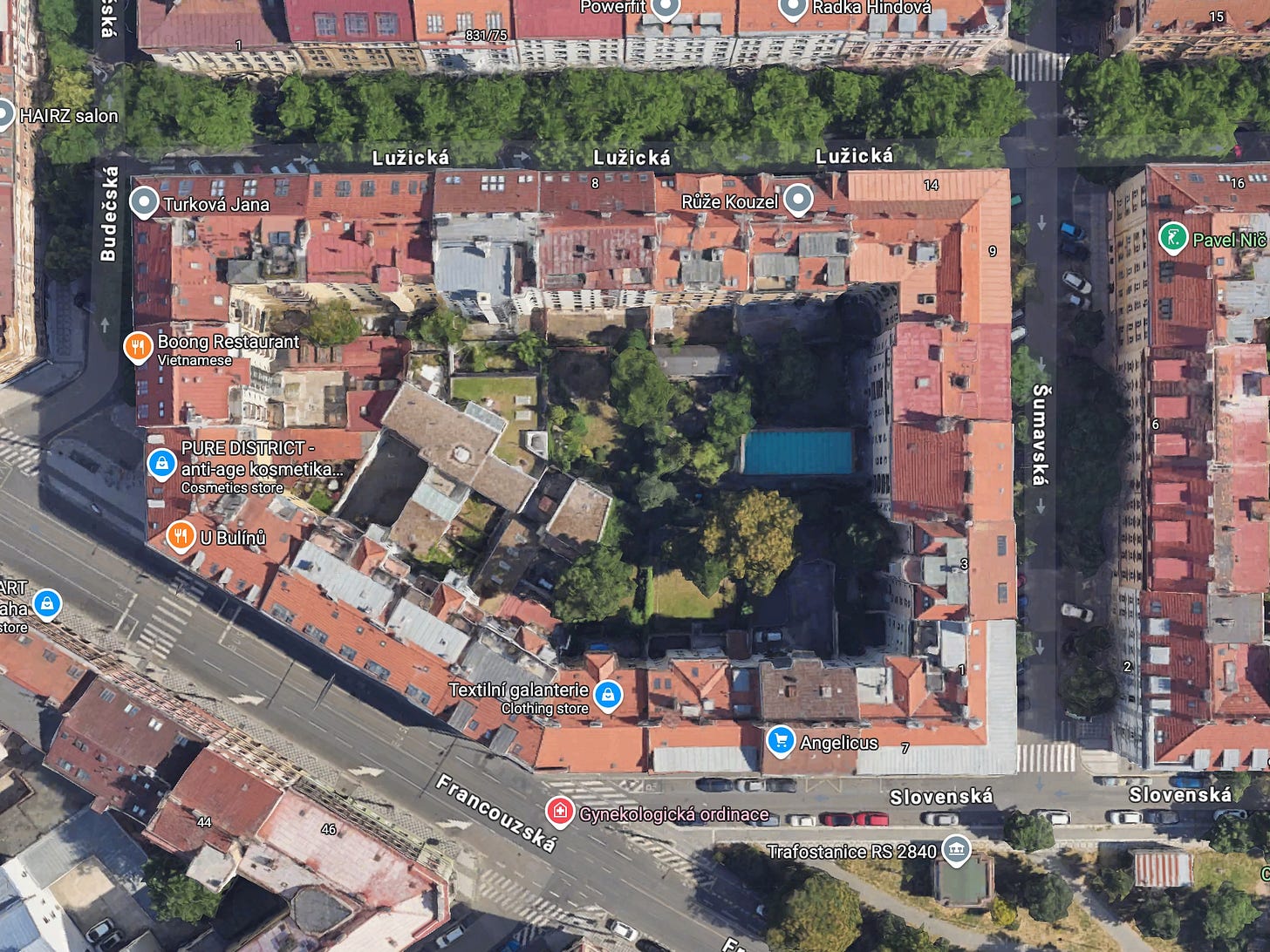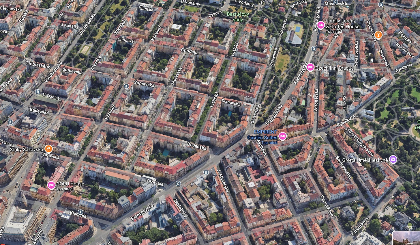 Look at Prague’s blocks. The standard buildings are mixed-use, multi-family buildings with 8-10 units above commercial spaces. They are wider (about 50 to 60 feet of street frontage) but shallow (40-50 feet), leaving more green space in the back.