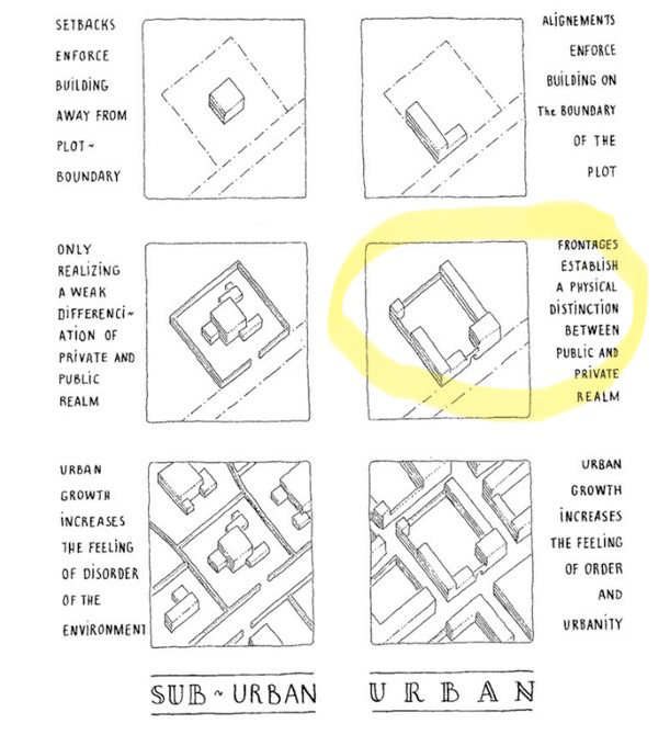 By concentrating building mass wide, shallow, and tall around the block’s perimeter, this design passively creates a physical distinction between public and private realm, a distinction that the architect and writer Leon Krier regarded as essential to the urban form: