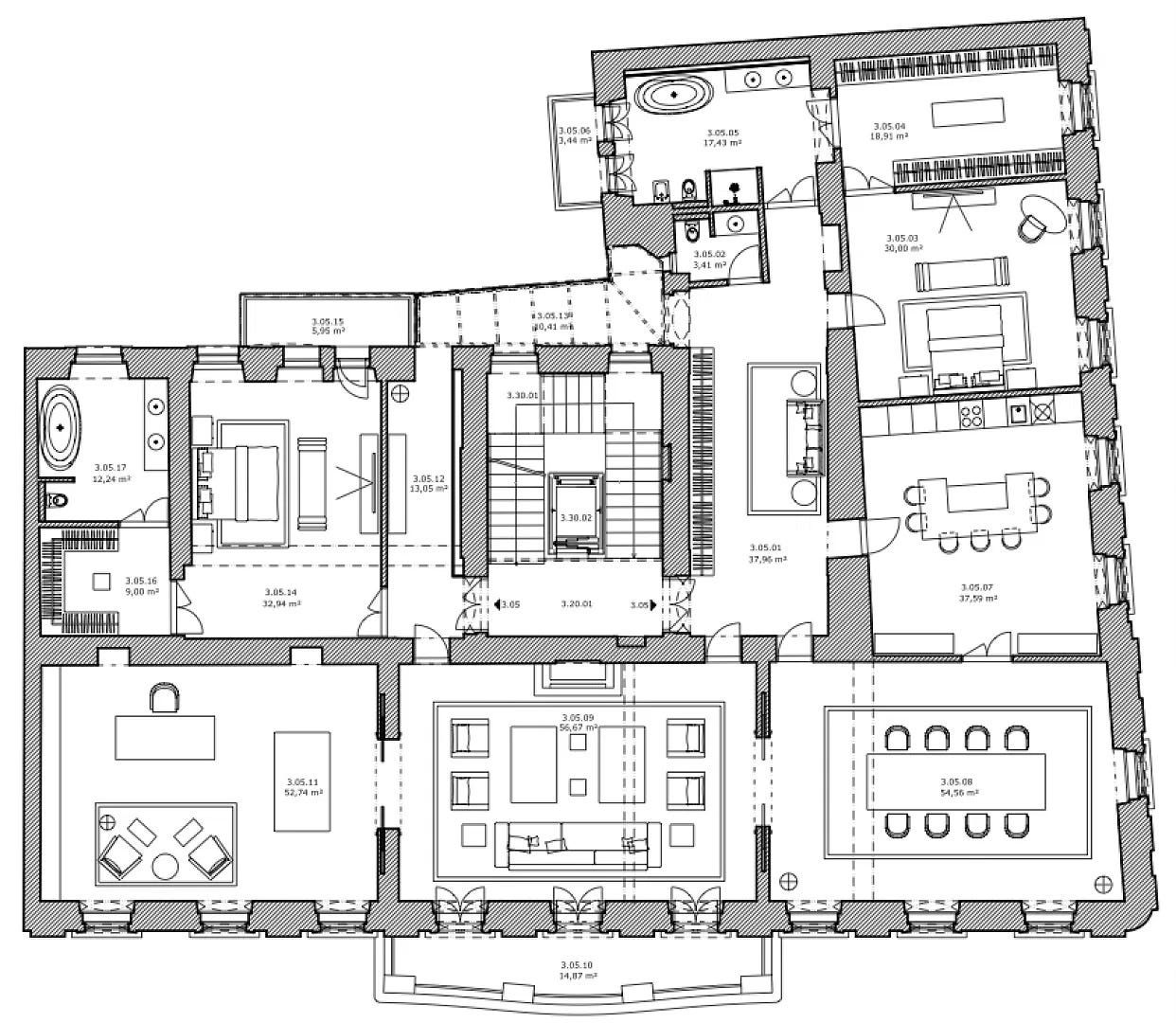Now, let us compare with unit layouts and rooms that are possible in the wide and shallow building, with window walls in the larger units that extend along the width of the building. Here is a 4BD in Prague: