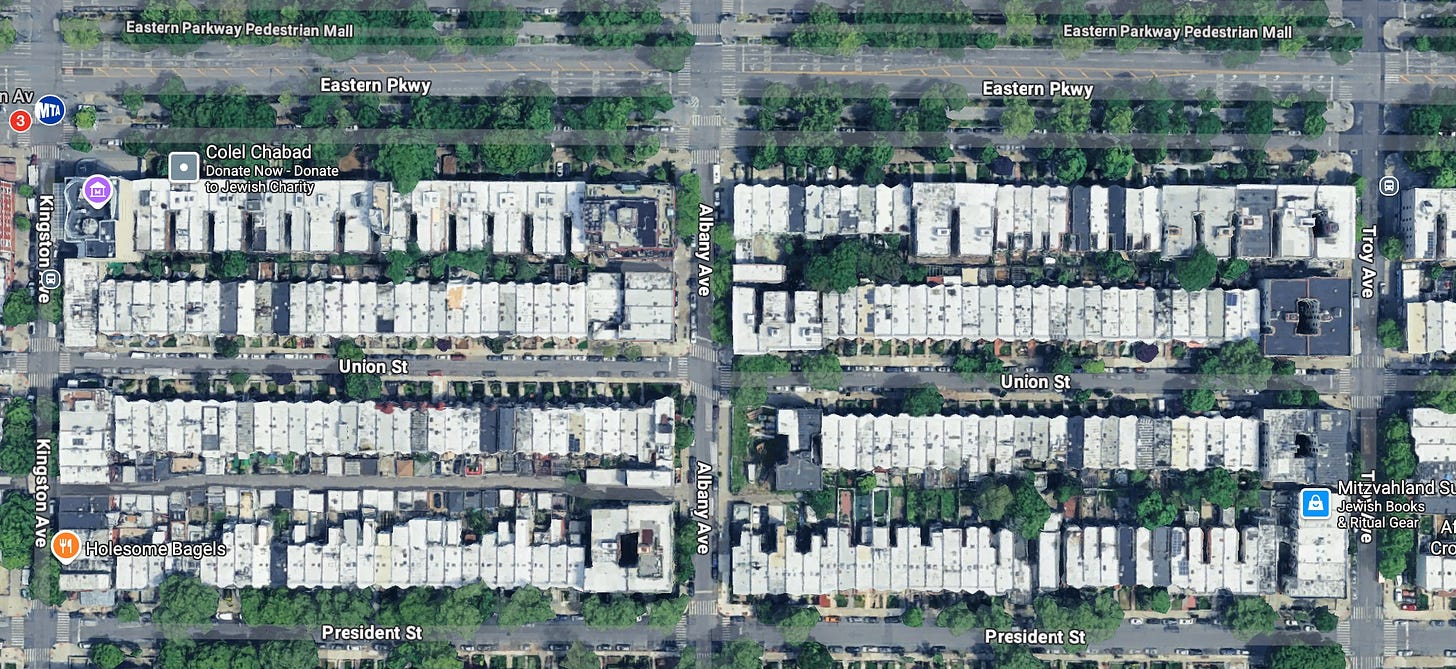 Take Brooklyn row houses from the 1800s, pictured below. These single-family homes share walls with neighbors but sit on long, narrow lots, making the short sides of the rectangle the primary window walls. This design results in poor light and ventilation in the center of the building. Additionally, these homes have front setbacks, causing buildings to extend deep into the lot and leaving very little usable green space in the block interior.