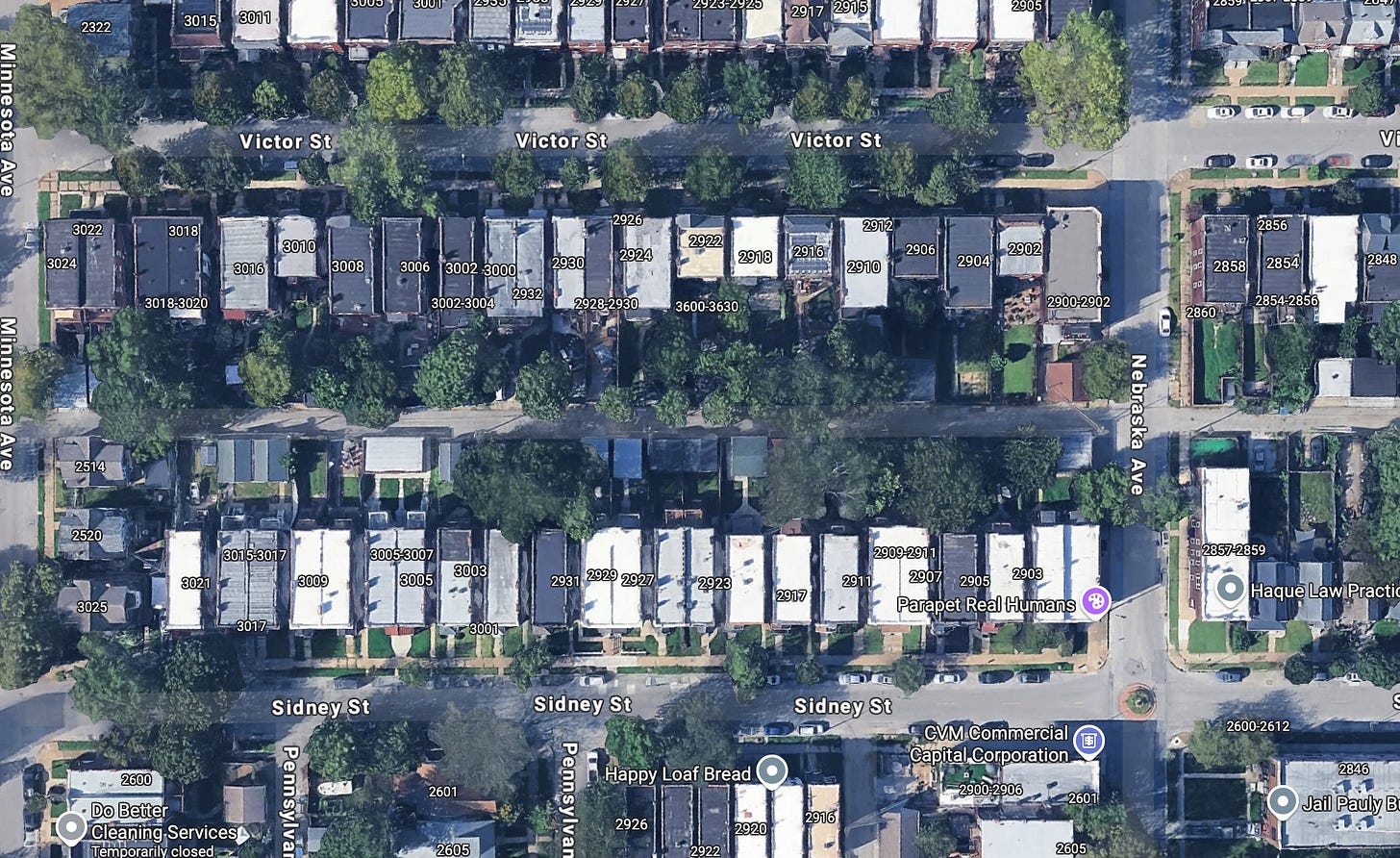 Now, consider St. Louis (below), which resembles Chicago in having alleys that provide access to garages at the rear. The lots are narrow and deep, typically 25’x125’ as they are in Chicago. The buildings are mostly freestanding or slightly detached, set back from the street, and extend deep into the lot. The alleys and setbacks make the block porous, allowing noise, cars, and other disturbances to penetrate easily from the street into the interior. As a result, there is almost no usable yard space, and no continuous building perimeter to shield the block’s private interior.
